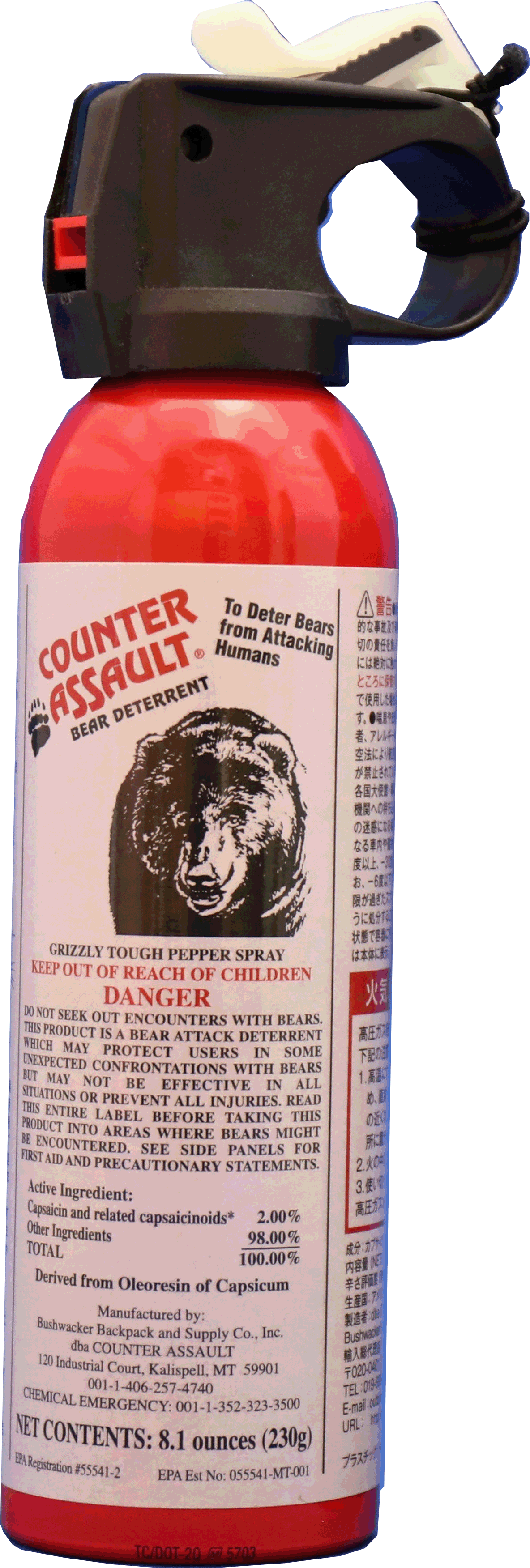 元祖・熊撃退スプレー 「カウンターアソールト」(CA230) 米国環境保護局(U.S. Environmental Protection Agency)により世界で初めて「クマ撃退に効果有り」と公式に登録された元祖・熊撃退スプレーです。